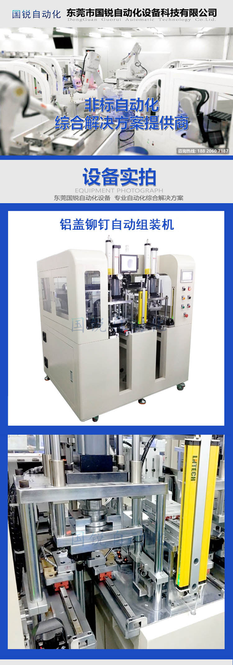 鋁蓋鉚釘自動組裝設(shè)備包含自動上料裝置,CCD視覺定位模塊、自動插鉚釘機構(gòu)和自動鉚釘壓合機構(gòu),可實現(xiàn)汽車零配件中,銘牌與產(chǎn)品的自動鉚釘上料壓合。