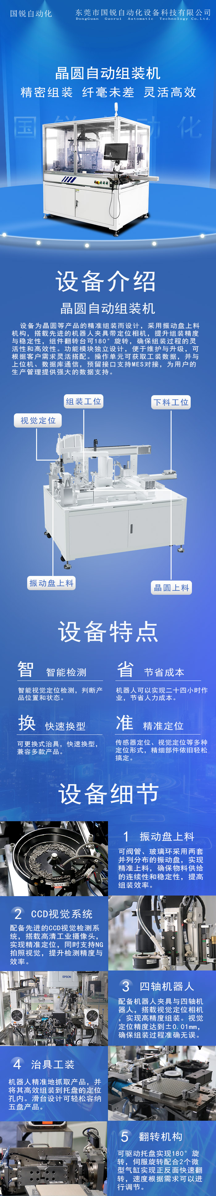 設(shè)備為精密、精準(zhǔn)組裝設(shè)計,可組裝精密芯片、晶圓、可閥管、玻璃環(huán)等精密產(chǎn)品,采用振動盤上料機構(gòu),搭載先進的機器人夾具帶定位相機,提升組裝精度與穩(wěn)定性,組件翻轉(zhuǎn)臺可180°旋轉(zhuǎn),確保組裝過程的靈活性和高效性。功能模塊獨立設(shè)計,便于維護與升級,可根據(jù)客戶需求靈活搭配。操作單元可獲取工裝數(shù)據(jù),并與上位機、數(shù)據(jù)庫通信,預(yù)留接口支持MES對接,為用戶的生產(chǎn)管理提供強大的數(shù)據(jù)支持。