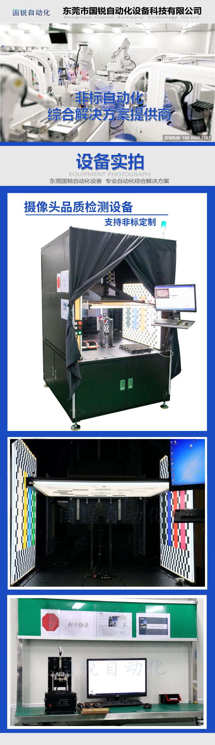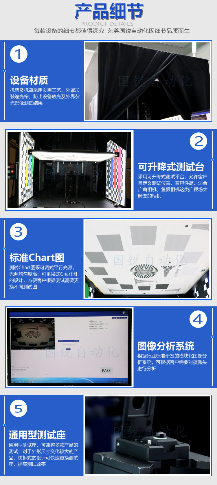 主要配件:自動升降機構(gòu)1套、光學(xué)背光板+Chart圖3套,安裝于左右兩側(cè)及頂部自動升降機構(gòu),攝像頭定位治具1套,測試系統(tǒng)1套。