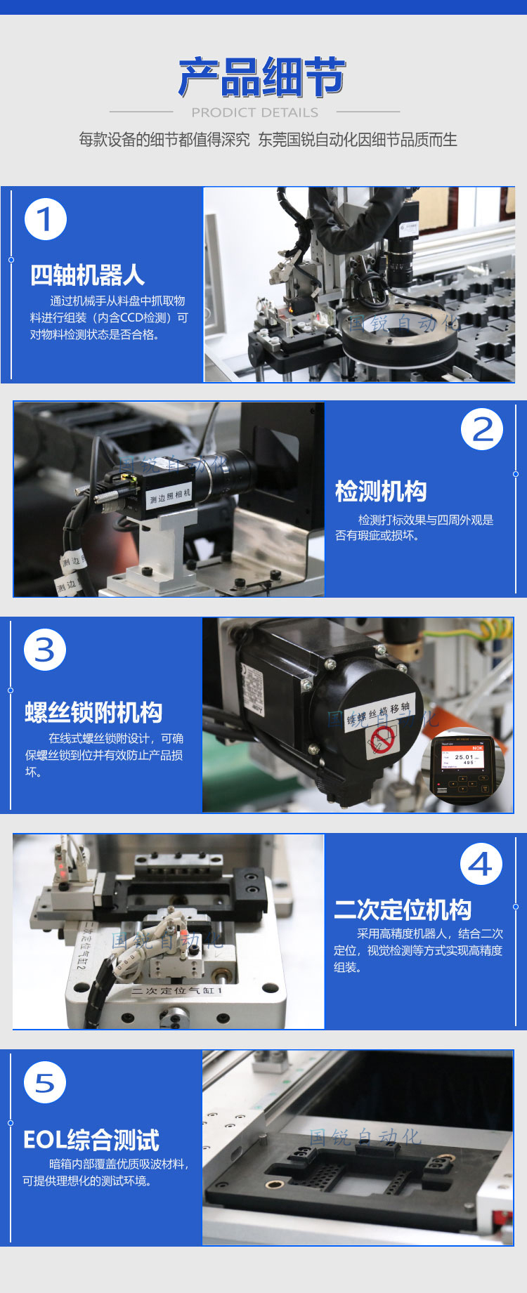 • EOL暗箱綜合測(cè)試、螺絲鎖附、外觀檢測(cè)、激光打標(biāo)等工藝