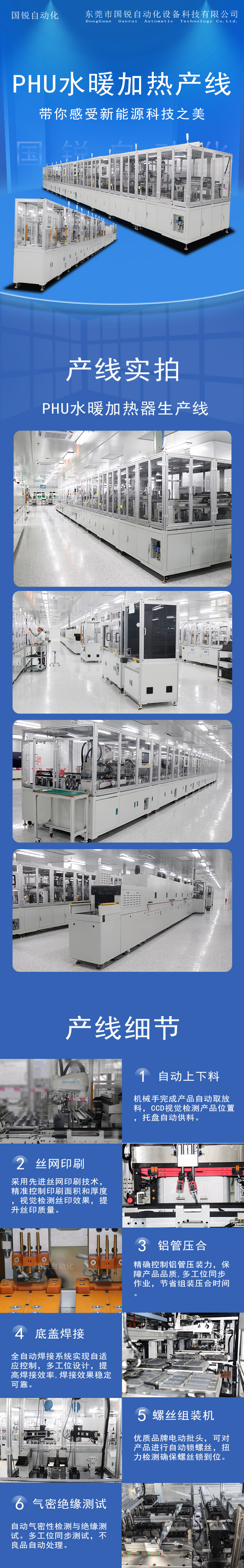 PHU水暖加熱器產(chǎn)線是國銳自主研發(fā)的PHU水暖加熱器產(chǎn)品自動(dòng)化產(chǎn)線。
