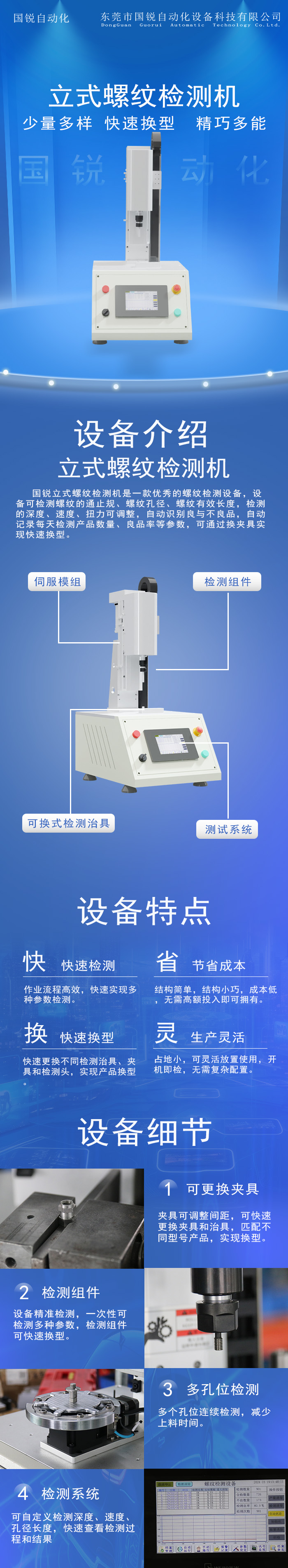 國銳立式螺紋檢測機(jī)是一款優(yōu)秀的螺紋檢測設(shè)備,設(shè)備可檢測螺紋的通止規(guī)、螺紋孔徑、螺紋有效長度,檢測的深度、速度、扭力可調(diào)整,自動(dòng)識(shí)別良與不良品,自動(dòng)記錄每天檢測產(chǎn)品數(shù)量 良品率等參數(shù),可通過換夾具實(shí)現(xiàn)快速換型,適合少量多樣的產(chǎn)品。