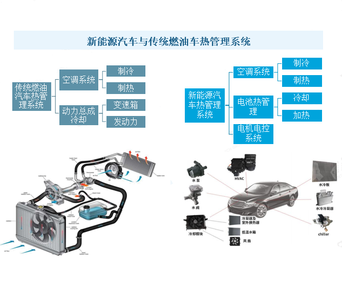 新能源汽車熱管理系統(tǒng)是不可或缺的部件,隨著我國不斷推進汽車電動化轉型和“雙碳”目標的實施,新能源汽車產銷量持續(xù)增長,也帶動了熱管理系統(tǒng)的需求上升。相比傳統(tǒng)燃油車,新能源汽車熱管理系統(tǒng)更為復雜,由電池、電驅、電控三電系統(tǒng)替代了傳統(tǒng)的三大部件。因此,新能源汽車熱管理系統(tǒng)所需零部件較傳統(tǒng)燃油車有所不同,除了對零部件性能要求更高外,還新增了冷卻板、電池冷卻器、PTC加熱器等。