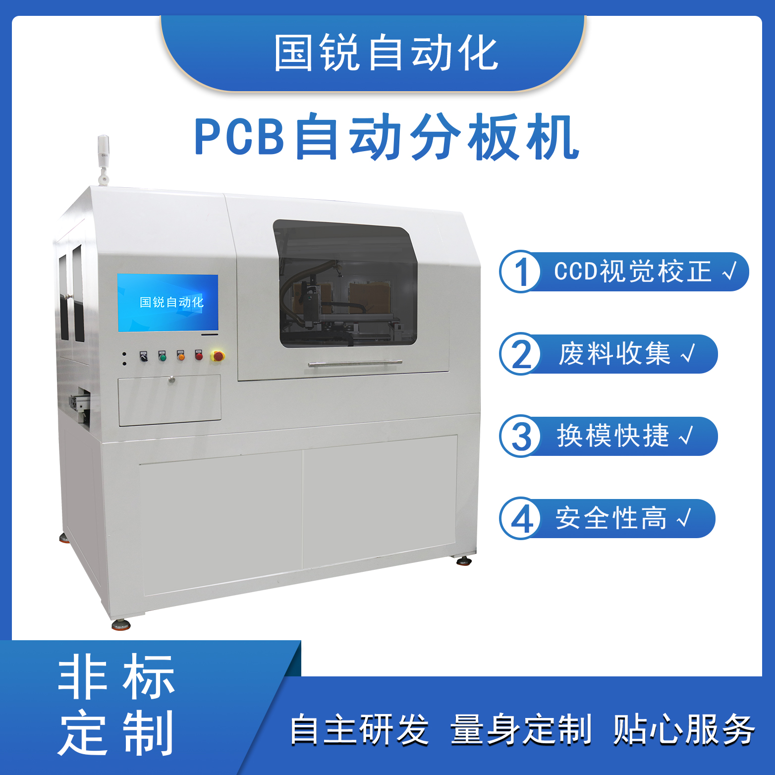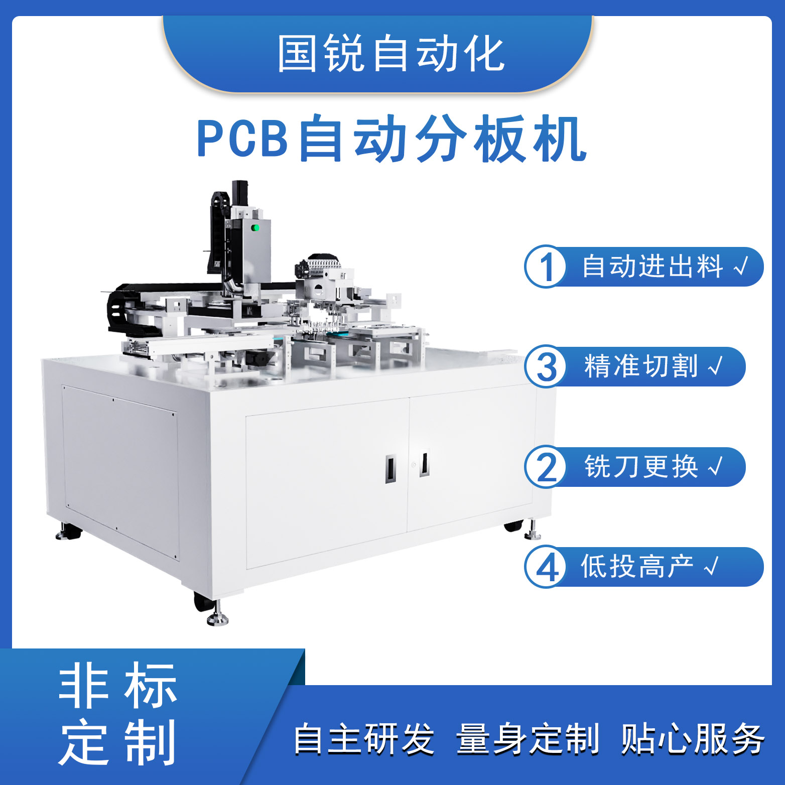 國銳自動化PCBA分板機集成了先進的技術(shù)和功能,能夠滿足各種復(fù)雜的分板需求,提供高效、高精度的分板解決方案。分板模組由XYZ三軸和旋轉(zhuǎn)主軸組成,采用銑刀分板技術(shù)。上料工位兼容多種上料模式,操作簡單易行。